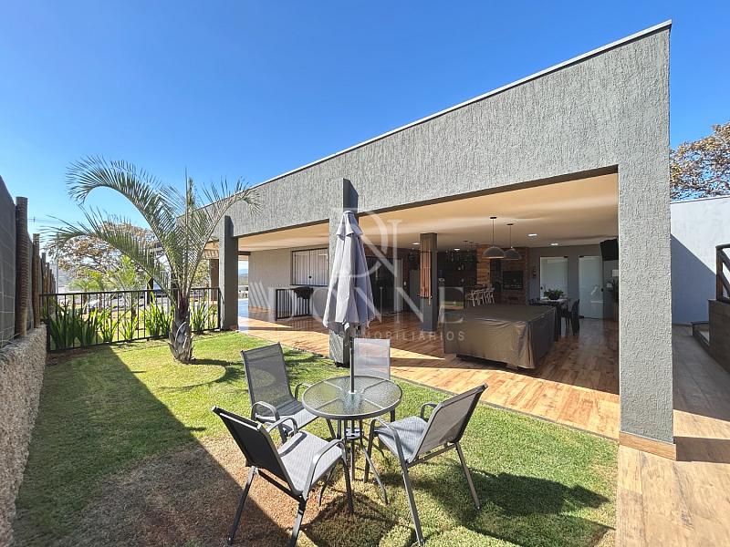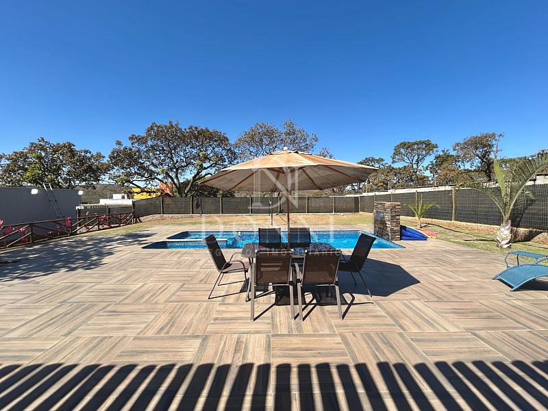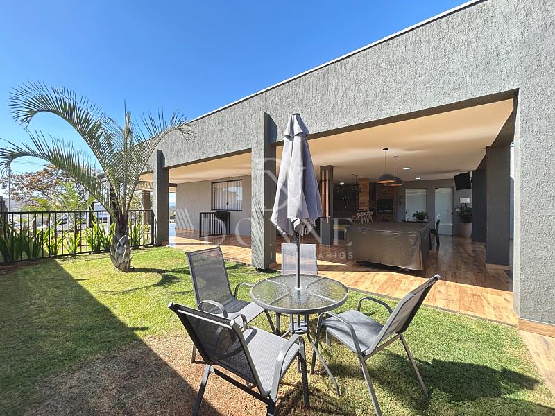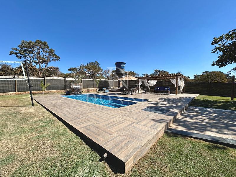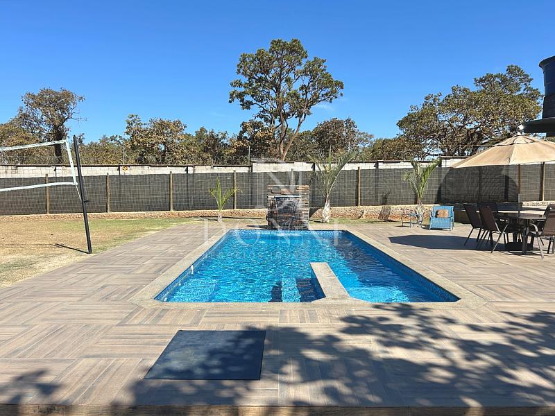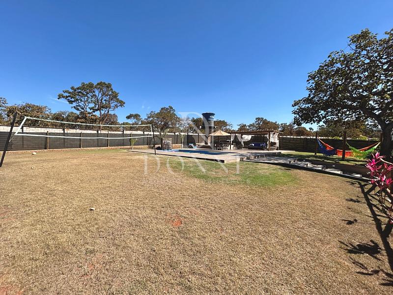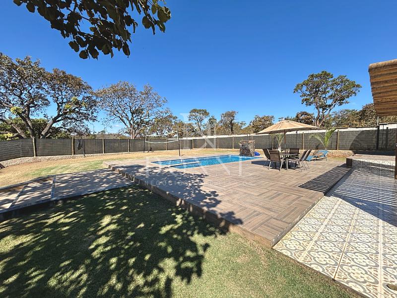 Área externa com piscina, pergolado e quadra gramada.